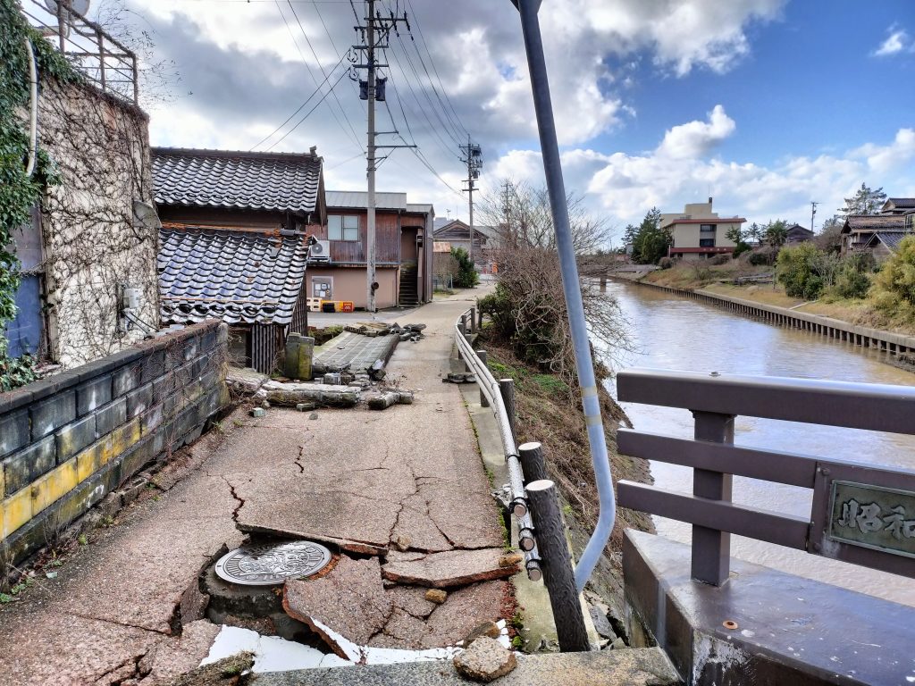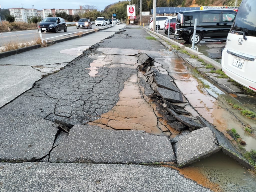 午前11時30分撮影。富来川横の道路は大きくひび割れ、地盤の隆起によりマンホールが不自然に突き出していた。ブロック塀は倒れ、周囲にはコンクリート片や瓦礫が散乱していた。