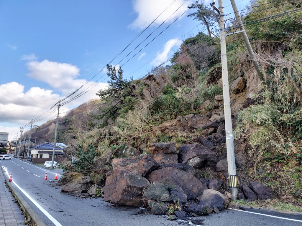 [IMG20240104110156]という画像ファイル名から撮影日時が分かる。2024年1月4日、午前11時1分56秒撮影。富来地区の商店街に向かう道路は、崖が崩落し、大きな岩が道を塞いでいた。