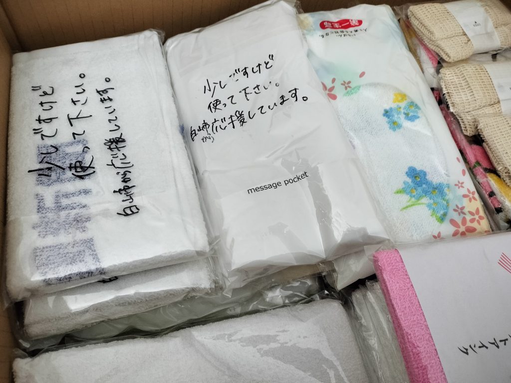 商工会には、たくさんの支援物資が届いていた。 タオルには「白山市から 応援しています」というメッセージが添えられていた。