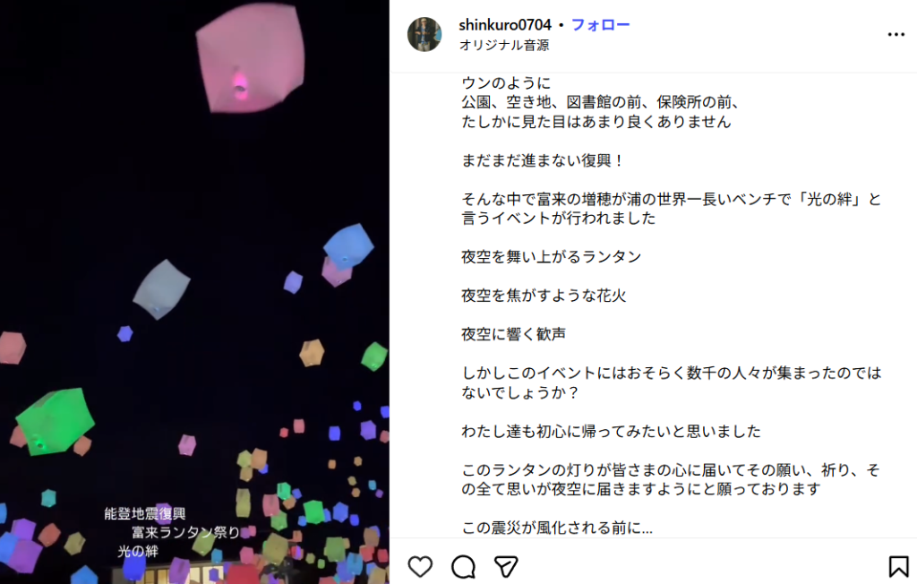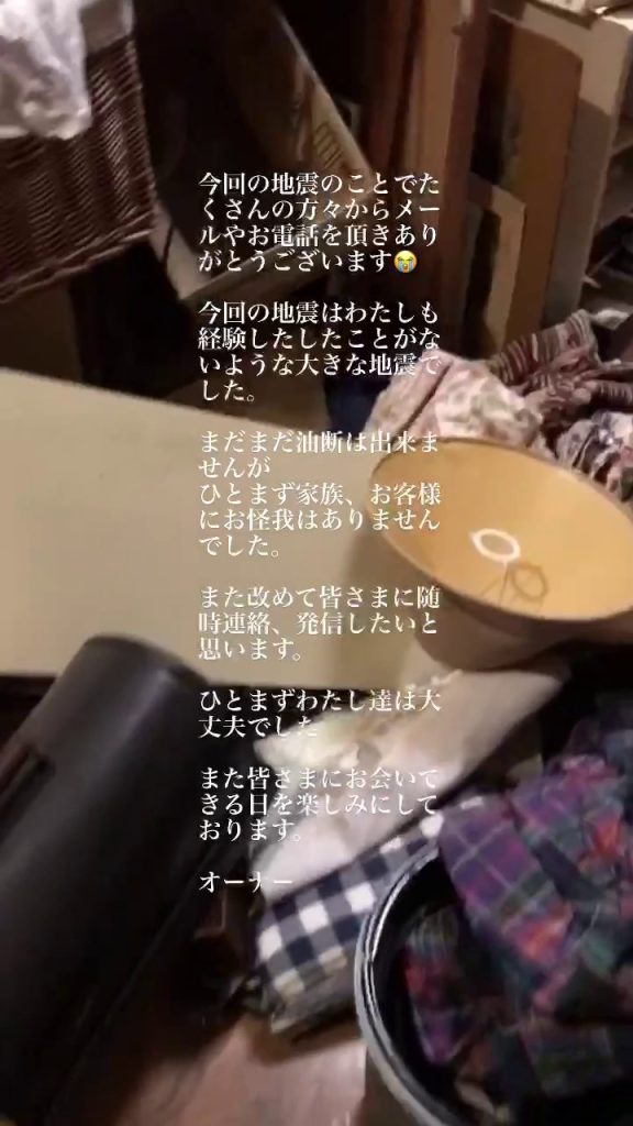 オーナーの黒崎信司さん、能登半島地震の事をインタグラムで発信し続けている。