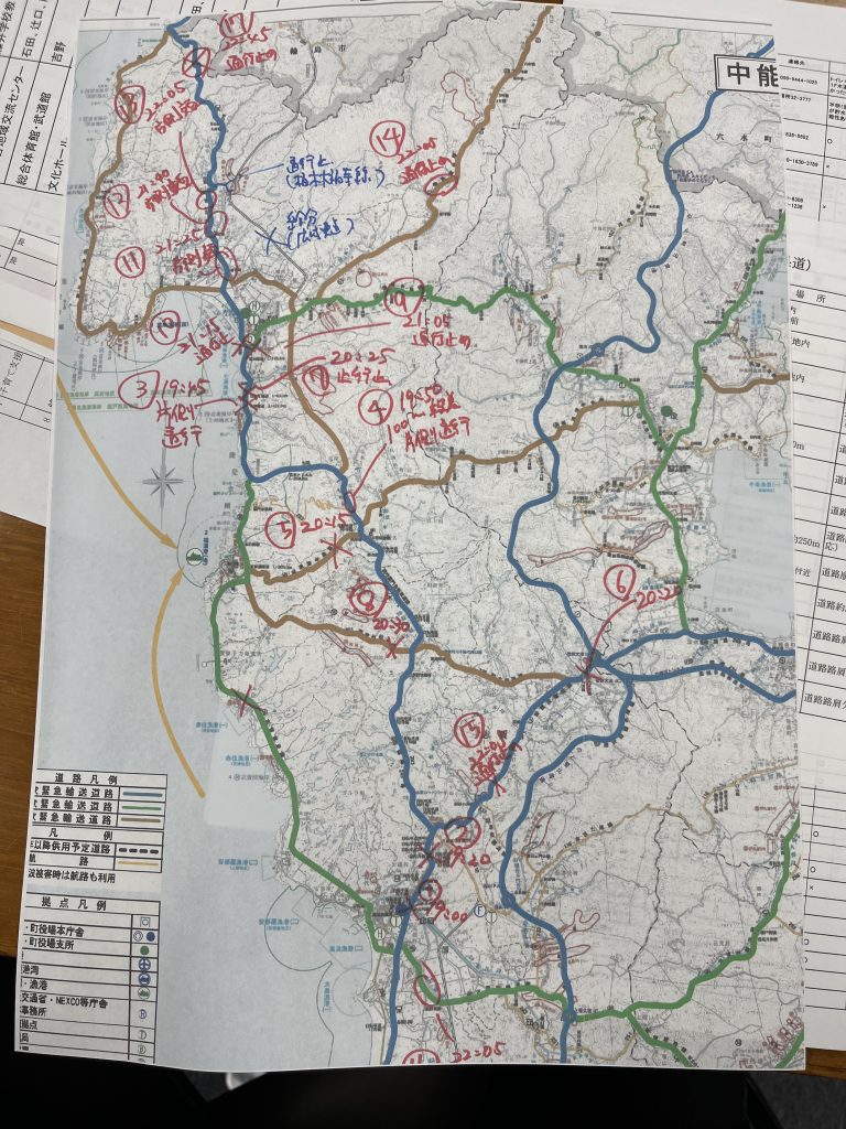 「そこらじゅうに人が出ていて、道はいたるところに亀裂が入っていて、崩落している崖もあったし……。役場に行くまでに川を2つ渡らなきゃいけないんですけど、最初の橋がまず渡れなくて、う回路を探して渡れる橋を見つける、通れる道を見つけて走るという繰り返しでした。脇道を抜けて、通常15分のところ1時間近くかかって役場に着きました」